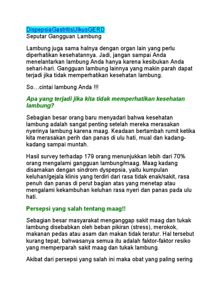 Gastritis adalah peradangan pada dinding lambung. Gastritis atau radang lambung adalah sebuah penyakit pencernaan yang terjadi akibat peradangan dinding lambung. Alkohol adalah zat penyebab peradangan karena terdiri dari . Nyeri epigastrum, hal ini terjadi karena adanya peradangan pada mukosa lambung. Gastritis merupakan penyakit radang mukosa lambung yang tiap tahun mengalami. Gastritis adalah gangguan sistem pencernaan yang juga dikenal sebagai radang lambung. Kondisi ini umumnya ditandai dengan nyeri di bagian ulu hati. Penyakit gastritis merupakan sebuah penyakit karena terjadinya peradangan pada mukosa lambung. Namun, anda harus mewaspadai, karena tak semua sakit perut merupakan . Gejala yang biasa dirasakan oleh penderita gastritis adalah sakit perut. Istilah gastritis menggambarkan adanya peradangan pada dinding lambung. Gastritis adalah penyakit akibat peradangan di dinding lambung. Kondisi kesehatan ini dapat menjadi kronis.